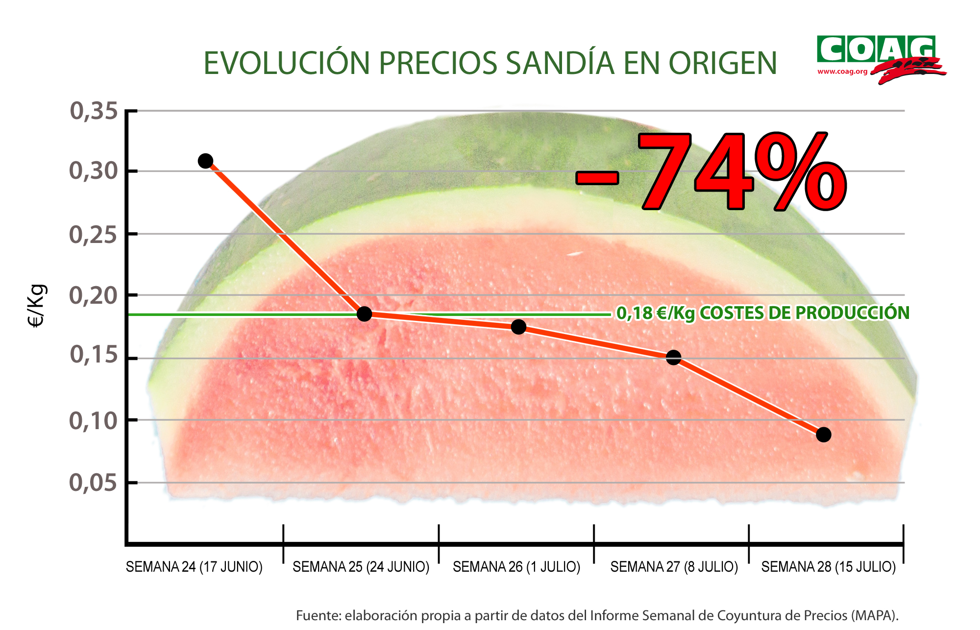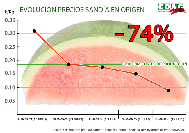 COAG sostiene que los agricultores están cansados de “financiar” la utilización de la fruta de verano como producto reclamo por parte de las grandes superficies comerciales. La caída de los precios de la sandía supone un “efecto arrastre” para el resto de fruta de verano (melón, melocotón, nectarina, ciruela, etc…), lastrando la rentabilidad de las explotaciones durante el resto de la campaña. En el caso del melón, la tendencia ya ha experimentado una clara tendencia a la baja, al pasar de 0,40€/kg semana 26, a cotizar por debajo de 0,25€/kg en semana del 11 de julio.